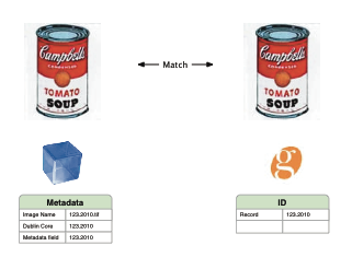 In diesem Szenario arbeiten die Systeme unabhängig voneinander und Sie verwenden Namenskonventionen und/oder Dateneingabe, um IDs zuzuweisen. Zum Beispiel hat jedes Asset in der TMS-Kunstdatenbank eine Aufsteigungsnummer. Diese Nummer wird den hochauflösenden Kunstwerken im DAM entweder im Dateinamen, in benutzerdefinierten Metadatenfeldern oder in eingebetteten Metadatenfeldern wie Dublin Core zugewiesen.